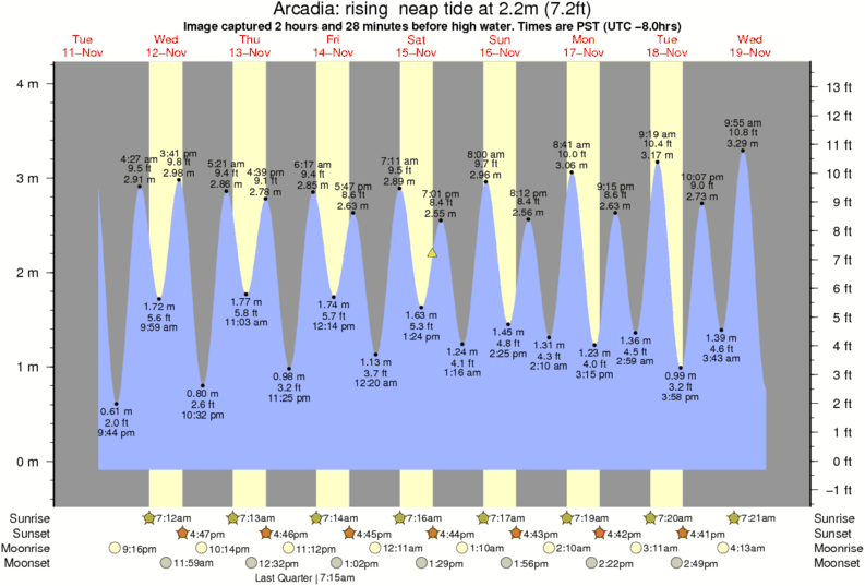 Image captured 2 hours and 28 minutes before high water (rising neap tide). Tide height was 2.2m (7.2 ft). Range 3.93m (12.9 ft). Toggle tide graph