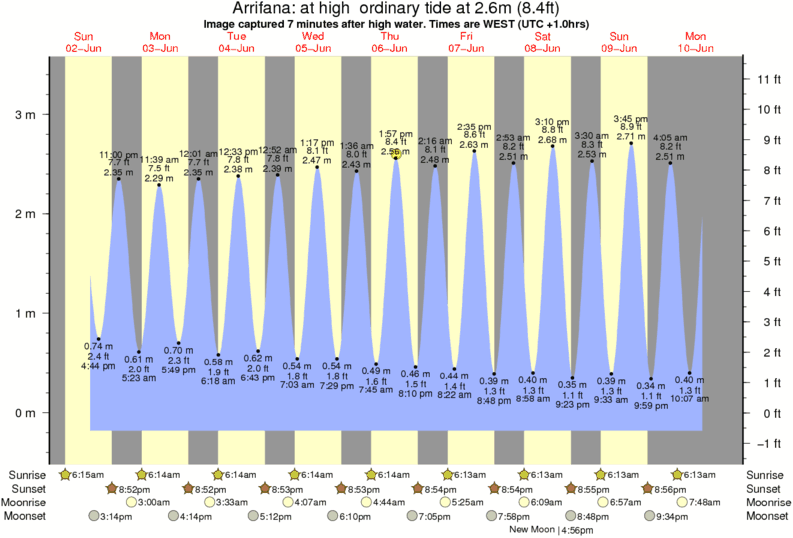Image captured 7 minutes after high water (at high ordinary tide). Tide height was 2.6m (8.4 ft). Range 3.42m (11.2 ft). Toggle tide graph