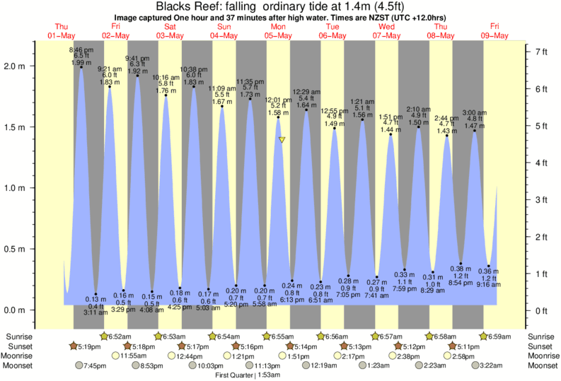 Image captured One hour and 37 minutes after high water (falling ordinary tide). Tide height was 1.4m (4.5 ft). Range 1.97m (6.5 ft). Toggle tide graph