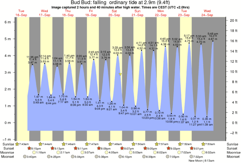 Image captured 2 hours and 40 minutes after high water (falling ordinary tide). Tide height was 2.9m (9.4 ft). Range 6.16m (20.2 ft). Toggle tide graph