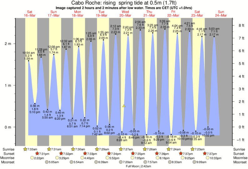 Image captured 2 hours and 2 minutes after low water (rising spring tide). Tide height was 0.5m (1.7 ft). Range 2.56m (8.4 ft). Toggle tide graph