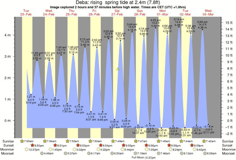 Image captured 2 hours and 37 minutes before high water (rising spring tide). Tide height was 2.4m (7.8 ft). Range 4.73m (15.5 ft). Toggle tide graph