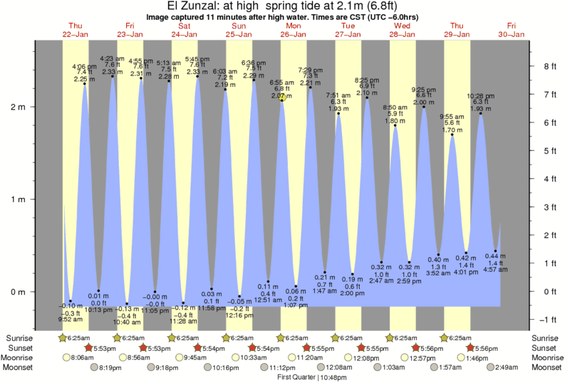 Image captured 11 minutes after high water (at high spring tide). Tide height was 2.1m (6.8 ft). Range 2.62m (8.6 ft). Toggle tide graph