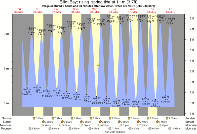 Image captured 2 hours and 33 minutes after low water (rising spring tide). Tide height was 1.1m (3.7 ft). Range 2.45m (8.0 ft). Toggle tide graph
