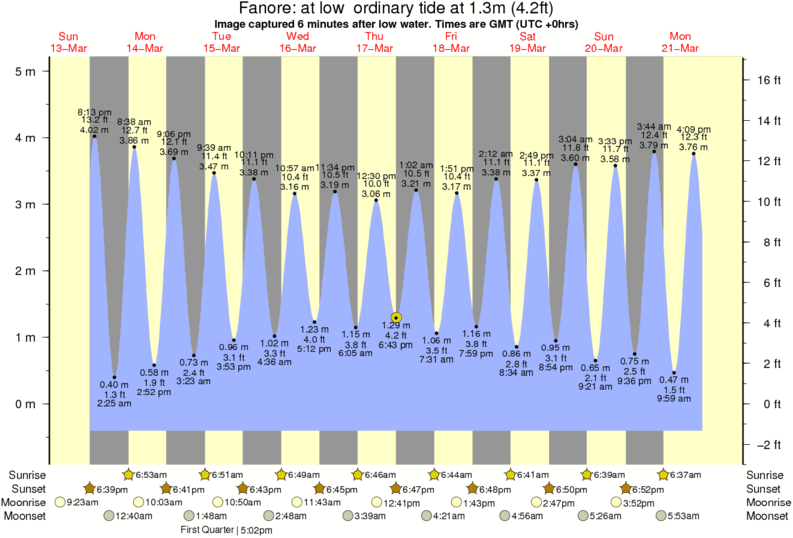 Image captured 6 minutes after low water (at low ordinary tide). Tide height was 1.3m (4.2 ft). Range 5.11m (16.8 ft). Toggle tide graph
