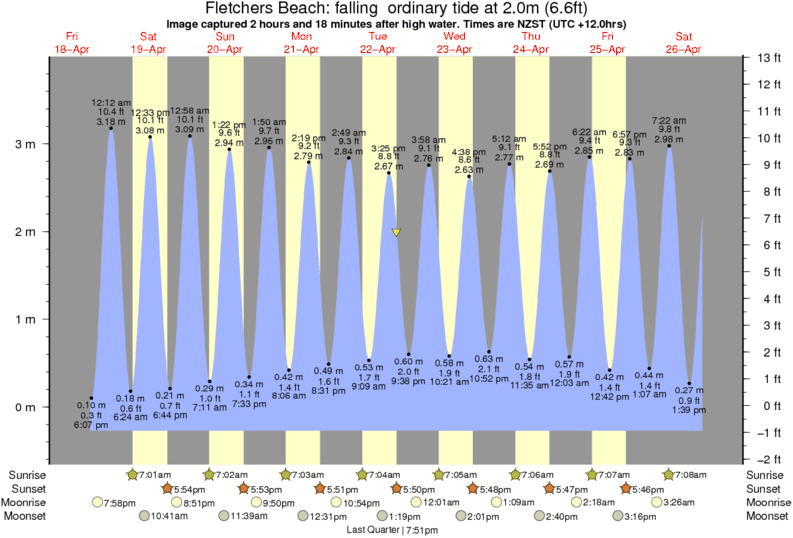 Image captured 2 hours and 18 minutes after high water (falling ordinary tide). Tide height was 2.0m (6.6 ft). Range 3.88m (12.7 ft). Toggle tide graph