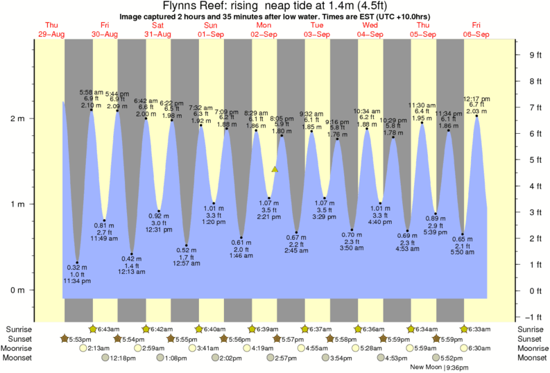 Image captured 2 hours and 35 minutes after low water (rising neap tide). Tide height was 1.4m (4.5 ft). Range 2.75m (9.0 ft). Toggle tide graph