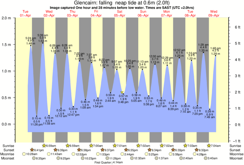 Image captured One hour and 28 minutes before low water (falling neap tide). Tide height was 0.6m (2.0 ft). Range 1.96m (6.4 ft). Toggle tide graph