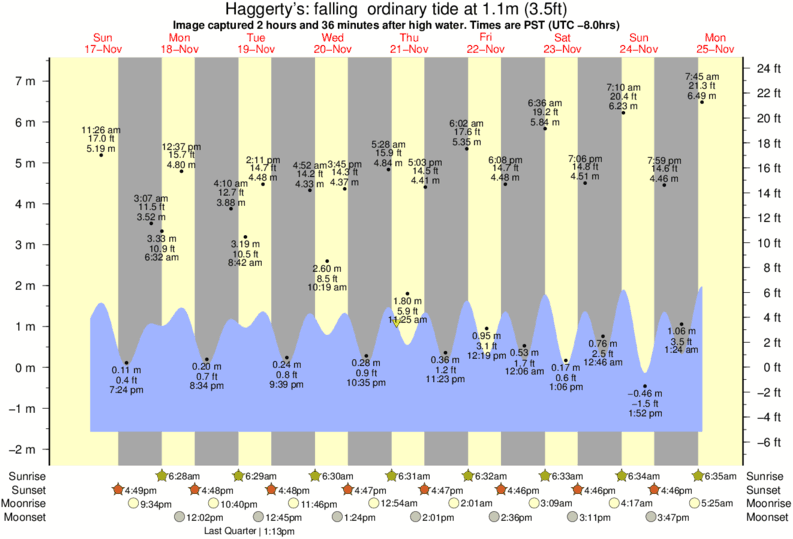 Image captured 2 hours and 36 minutes after high water (falling ordinary tide). Tide height was 1.1m (3.5 ft). Range 8.32m (27.3 ft). Toggle tide graph