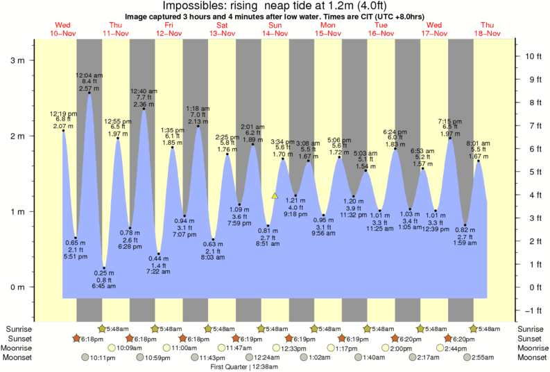 Image captured 3 hours and 4 minutes after low water (rising neap tide). Tide height was 1.2m (4.0 ft). Range 3.12m (10.2 ft). Toggle tide graph
