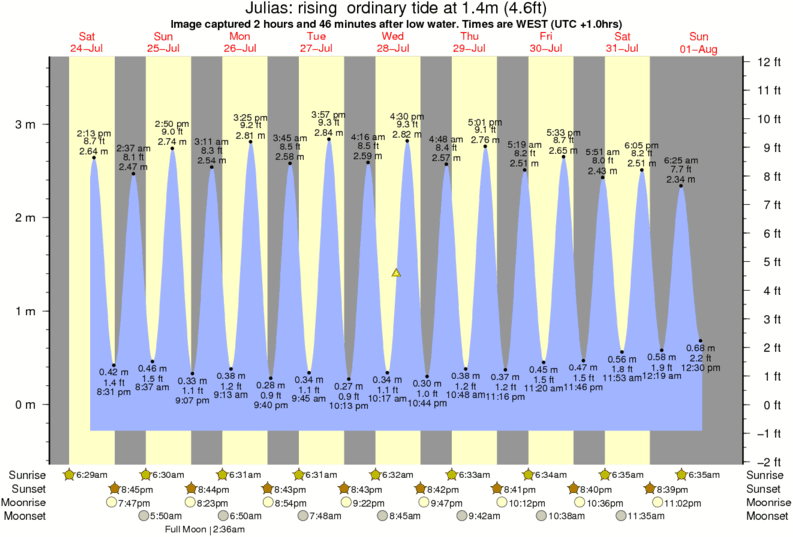 Image captured 2 hours and 46 minutes after low water (rising ordinary tide). Tide height was 1.4m (4.6 ft). Range 3.64m (11.9 ft). Toggle tide graph