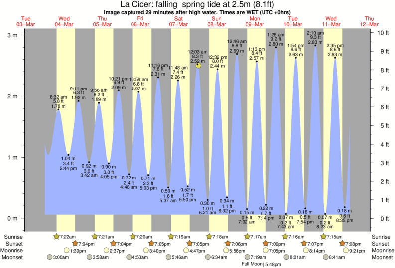 Image captured 29 minutes after high water (falling spring tide). Tide height was 2.5m (8.1 ft). Range 2.77m (9.1 ft). Toggle tide graph