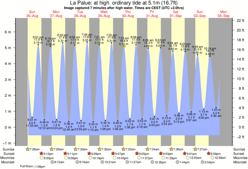 Image captured 7 minutes after high water (at high ordinary tide). Tide height was 5.1m (16.7 ft). Range 6.71m (22.0 ft). Toggle tide graph