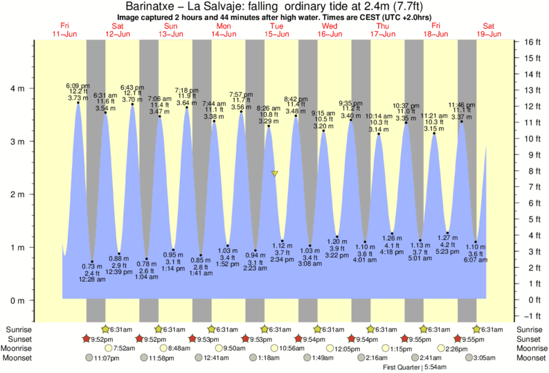 Image captured 2 hours and 44 minutes after high water (falling ordinary tide). Tide height was 2.4m (7.7 ft). Range 4.44m (14.6 ft). Toggle tide graph