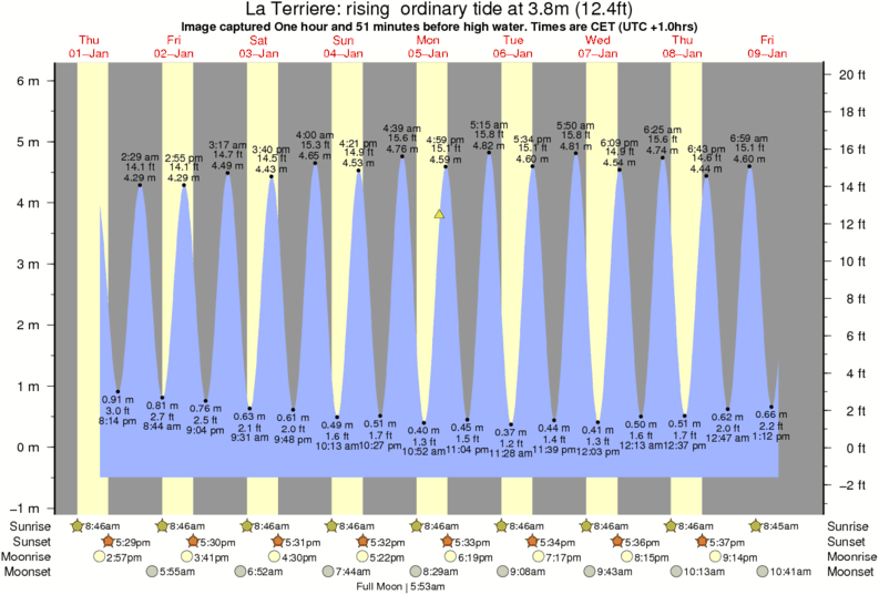 Image captured One hour and 51 minutes before high water (rising ordinary tide). Tide height was 3.8m (12.4 ft). Range 6.17m (20.2 ft). Toggle tide graph