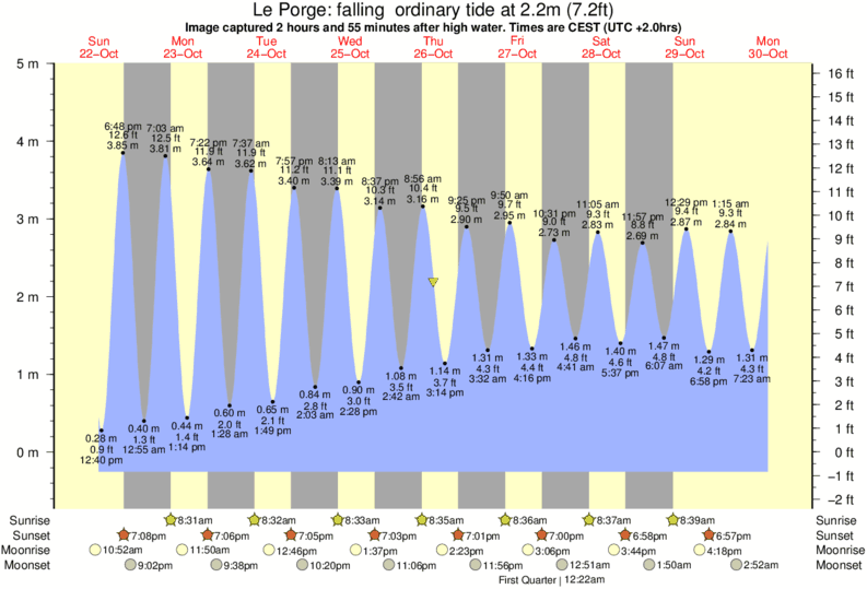 Image captured 2 hours and 55 minutes after high water (falling ordinary tide). Tide height was 2.2m (7.2 ft). Range 4.78m (15.7 ft). Toggle tide graph