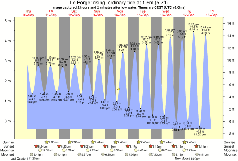 Image captured 2 hours and 2 minutes after low water (rising ordinary tide). Tide height was 1.6m (5.2 ft). Range 5.06m (16.6 ft). Toggle tide graph