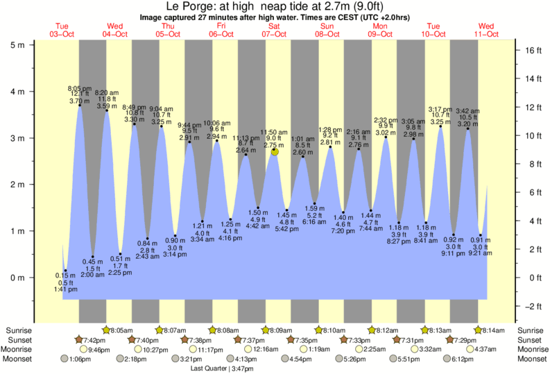 Image captured 27 minutes after high water (at high neap tide). Tide height was 2.7m (9.0 ft). Range 5.07m (16.6 ft). Toggle tide graph