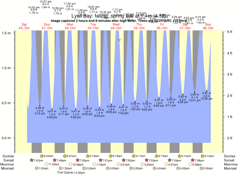 Image captured 2 hours and 9 minutes after high water (falling spring tide). Tide height was 1.4m (4.5 ft). Range 1.46m (4.8 ft). Toggle tide graph