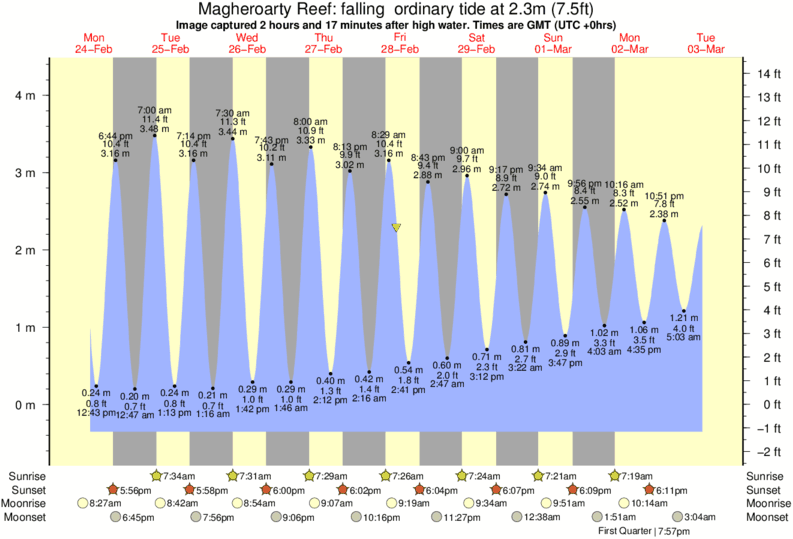 Image captured 2 hours and 17 minutes after high water (falling ordinary tide). Tide height was 2.3m (7.5 ft). Range 4.40m (14.4 ft). Toggle tide graph