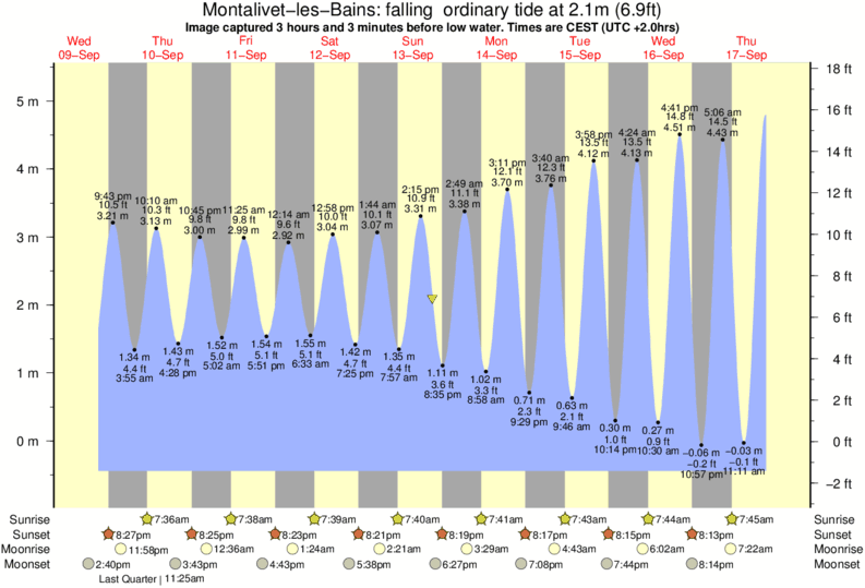Image captured 3 hours and 3 minutes before low water (falling ordinary tide). Tide height was 2.1m (6.9 ft). Range 5.46m (17.9 ft). Toggle tide graph