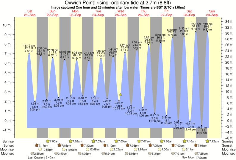 Image captured One hour and 28 minutes after low water (rising ordinary tide). Tide height was 2.7m (8.8 ft). Range 10.58m (34.7 ft). Toggle tide graph