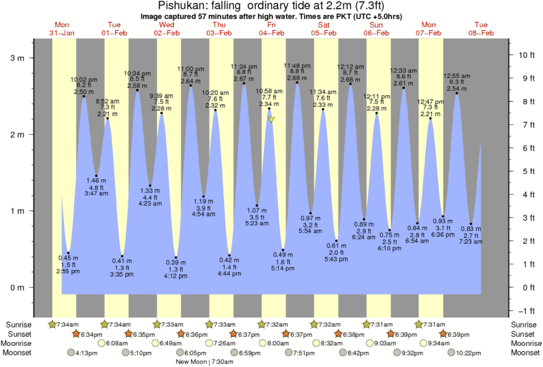 Image captured 57 minutes after high water (falling ordinary tide). Tide height was 2.2m (7.3 ft). Range 3.04m (10.0 ft). Toggle tide graph