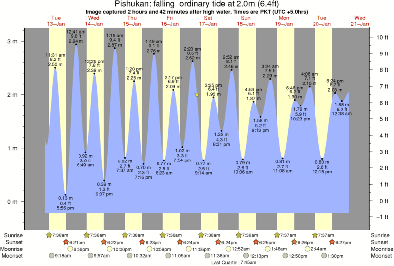 Image captured 2 hours and 42 minutes after high water (falling ordinary tide). Tide height was 2.0m (6.4 ft). Range 3.15m (10.3 ft). Toggle tide graph
