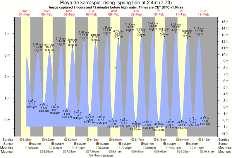 Image captured 2 hours and 42 minutes before high water (rising spring tide). Tide height was 2.4m (7.7 ft). Range 4.62m (15.2 ft). Toggle tide graph