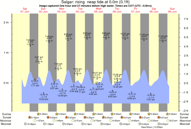 Image captured One hour and 27 minutes before high water (rising neap tide). Tide height was 0.0m (0.1 ft). Range 2.70m (8.9 ft). Toggle tide graph