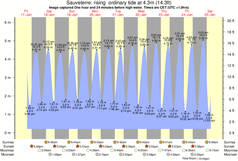 Image captured One hour and 24 minutes before high water (rising ordinary tide). Tide height was 4.3m (14.3 ft). Range 5.52m (18.1 ft). Toggle tide graph