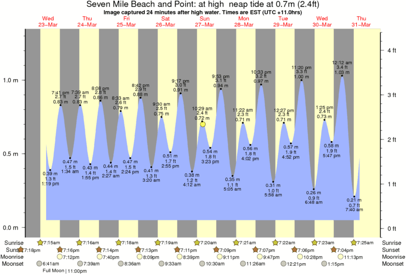 Forecast wind and swell just offshore from Seven Mile Beach and Point around the time the photo was taken