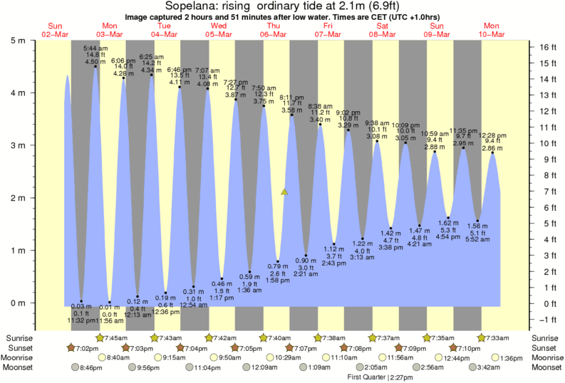 Image captured 2 hours and 51 minutes after low water (rising ordinary tide). Tide height was 2.1m (6.9 ft). Range 4.61m (15.1 ft). Toggle tide graph
