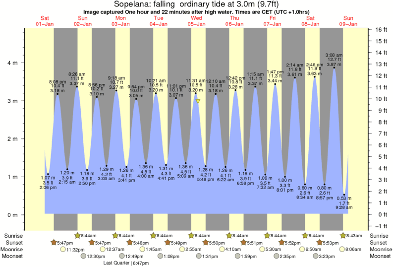 Image captured One hour and 22 minutes after high water (falling ordinary tide). Tide height was 3.0m (9.7 ft). Range 4.44m (14.6 ft). Toggle tide graph