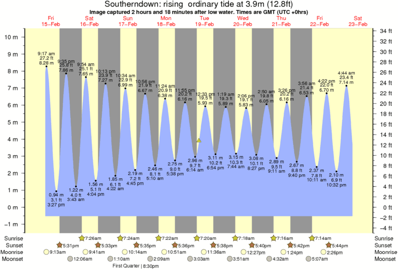 Image captured 2 hours and 18 minutes after low water (rising ordinary tide). Tide height was 3.9m (12.8 ft). Range 10.03m (32.9 ft). Toggle tide graph
