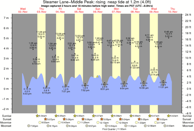 Forecast wind and swell just offshore from Steamer Lane-Middle Peak around the time the photo was taken