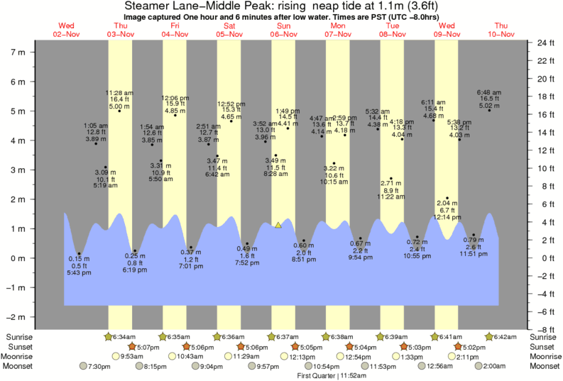 Image captured One hour and 6 minutes after low water (rising neap tide). Tide height was 1.1m (3.6 ft). Range 8.20m (26.9 ft). Toggle tide graph