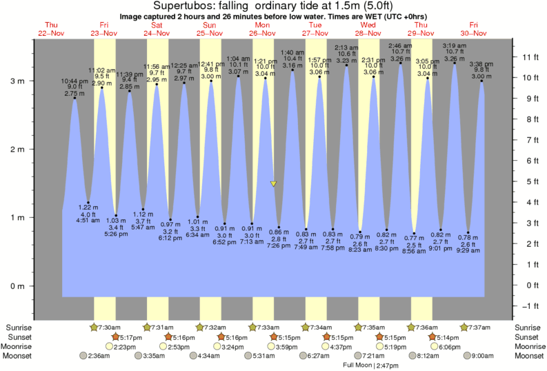 Image captured 2 hours and 26 minutes before low water (falling ordinary tide). Tide height was 1.5m (5.0 ft). Range 3.43m (11.3 ft). Toggle tide graph