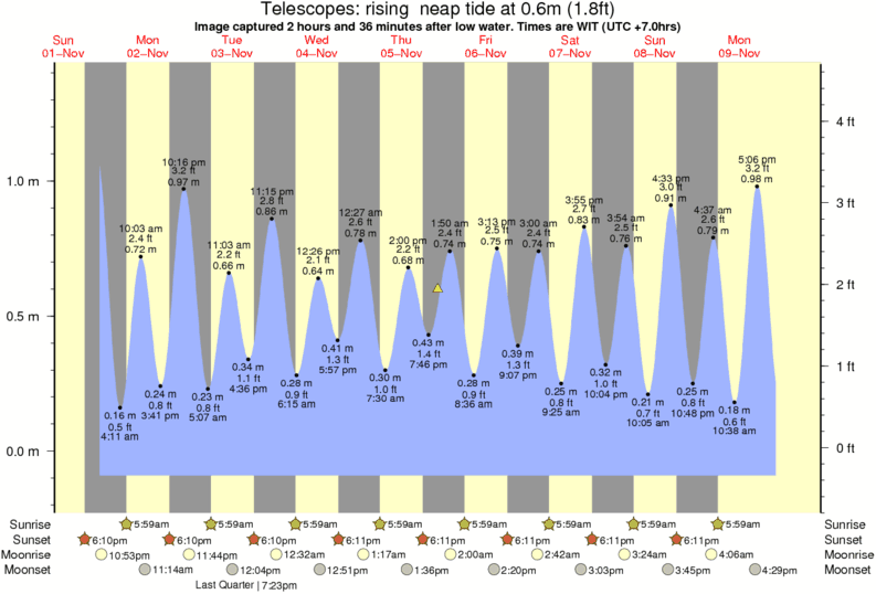 Image captured 2 hours and 36 minutes after low water (rising neap tide). Tide height was 0.6m (1.8 ft). Range 1.39m (4.6 ft). Toggle tide graph