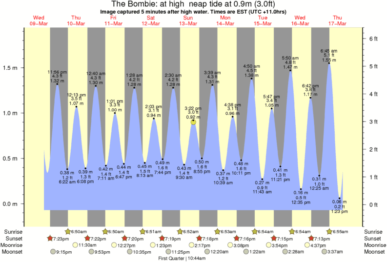 Image captured 5 minutes after high water (at high neap tide). Tide height was 0.9m (3.0 ft). Range 1.83m (6.0 ft). Toggle tide graph
