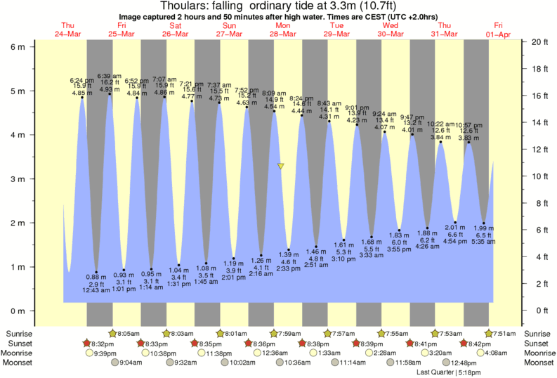 Image captured 2 hours and 50 minutes after high water (falling ordinary tide). Tide height was 3.3m (10.7 ft). Range 5.43m (17.8 ft). Toggle tide graph