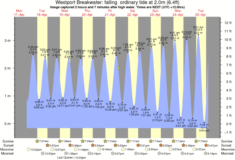 Image captured 2 hours and 7 minutes after high water (falling ordinary tide). Tide height was 2.0m (6.4 ft). Range 3.65m (12.0 ft). Toggle tide graph